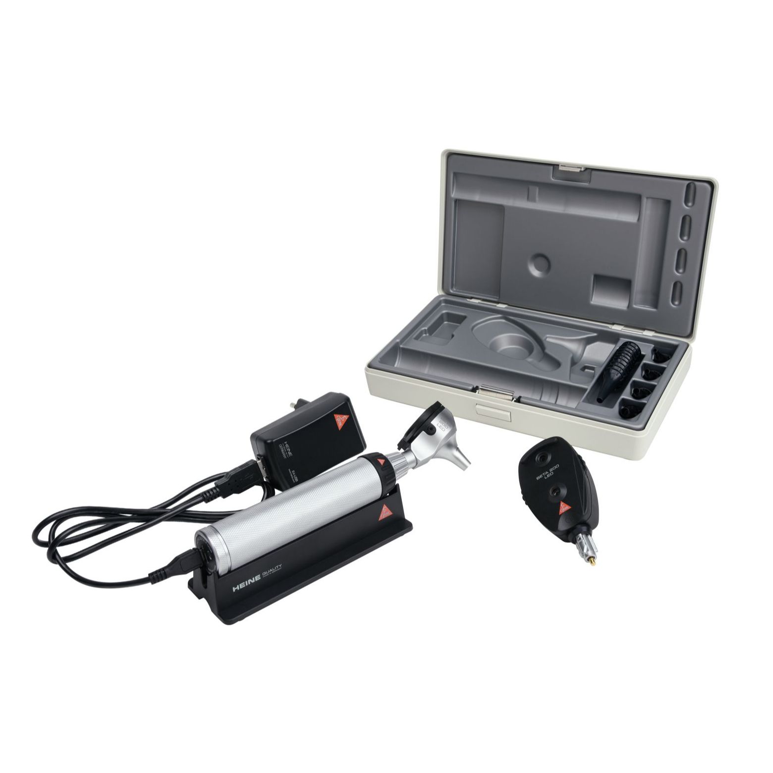 De Heine BETA 200 Oftalmoscoop + BETA 200 F.O. LED Otoscoop. In een complete set in de USB-uitvoering, bestaande uit: