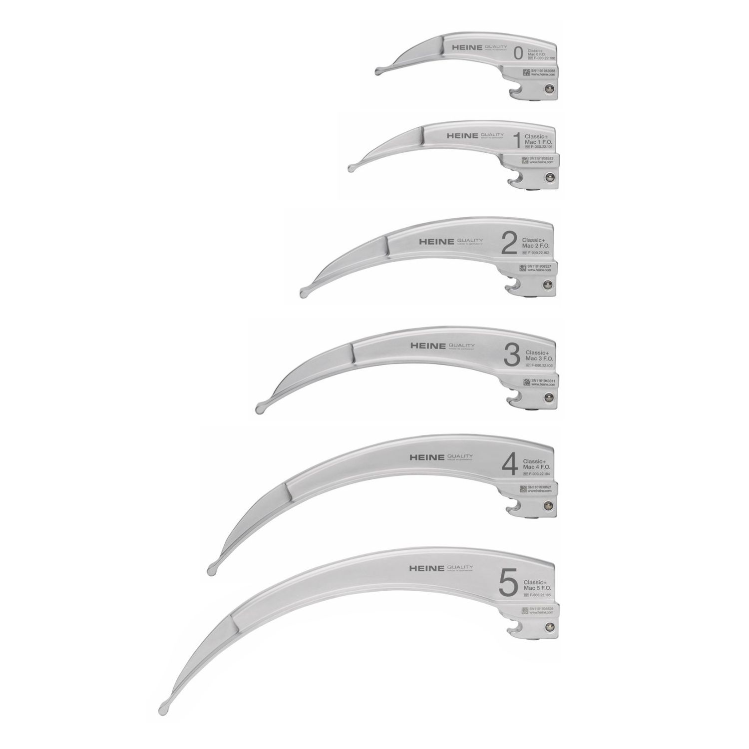 Heine Classic + Macintosh Fiber Optic bladen. Leverbaar in verschillende maten.