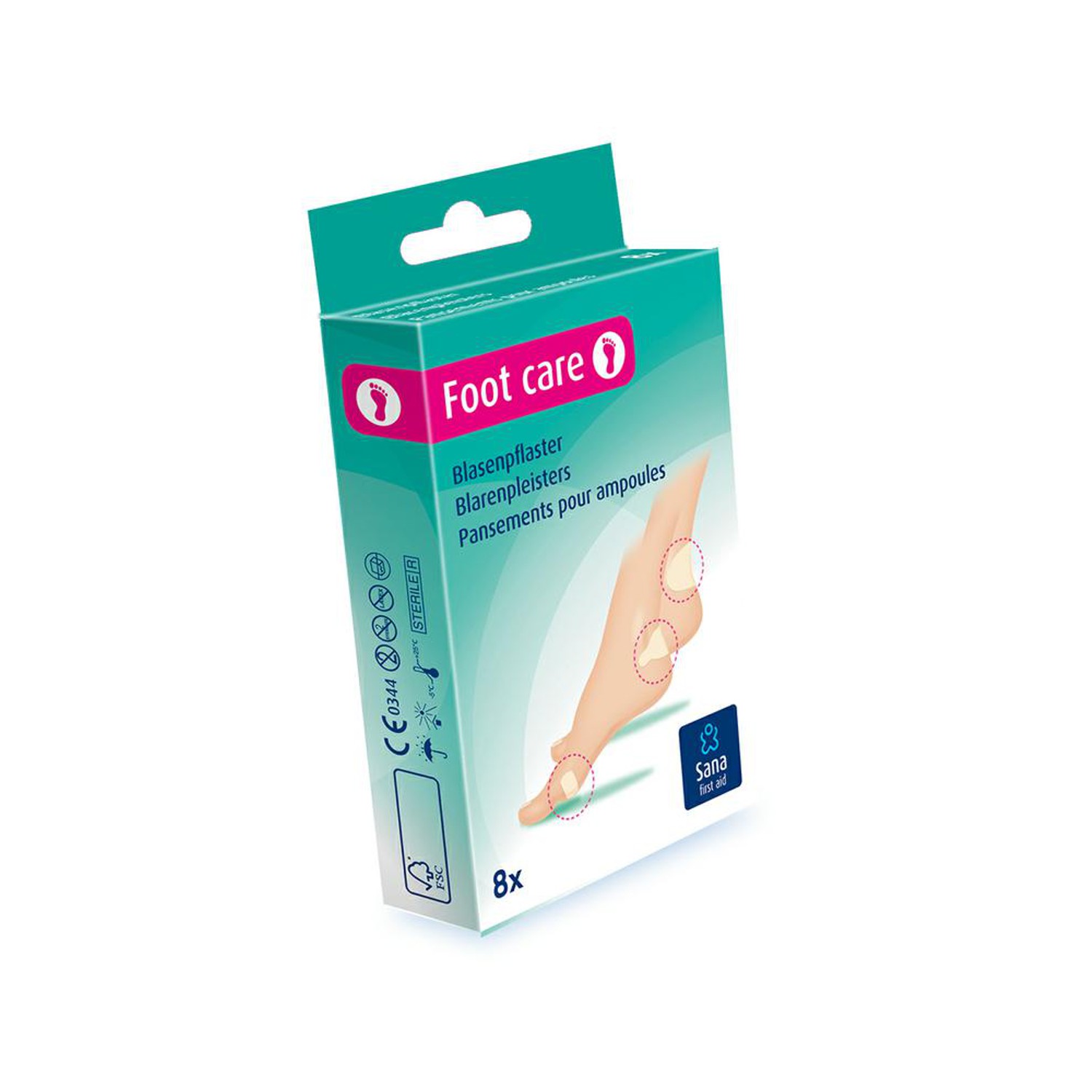 Sana First Aid Blarenpleisters in een vouwdoosje. De blarenpleisters hebben een preventieve werking om blaren door wrijving te voorkomen. De pleisters bevorderen de natuurlijke genezing van blaren. Ook geschikt voor kleine brandwonden.